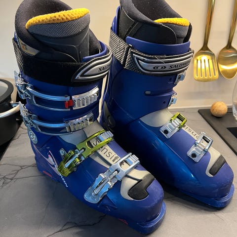 Salomon alpin støvler i størrelse 42-43, svart farge. Støvlene har 4 spenner for justering og er laget for å gi støtte og komfort ved skikjøring.