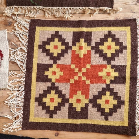 Håndvevd teppekunst i ull. Billedveven er i god stand. Nydelig på veggen i en kollasj, som duk på et lite bord eller under en potteplante. Har avstiver i furu på baksiden, så den henger pent på veggen. Kan enkelt fjernes om ønskelig. Måler 36x25 cm. Se mine andre annonser for mer vintage tekstiler og tepper.