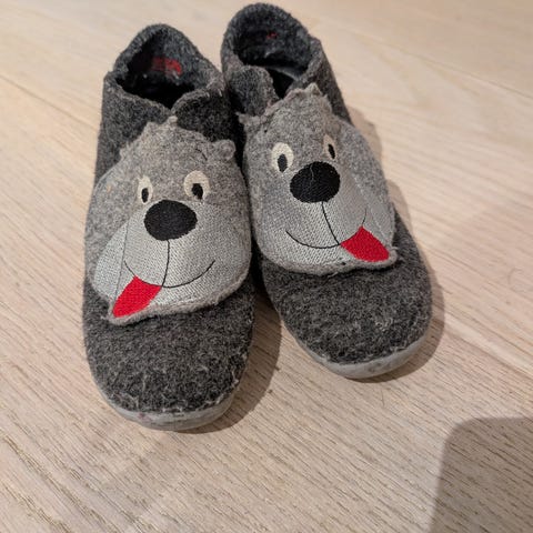 Superfit tøfler i størrelse 24. Mørk blå farge med musemotiv på borrelås. Ulltekstil med gummisåle for godt grep. Tøflene har blitt nuppete, men er ellers fine.