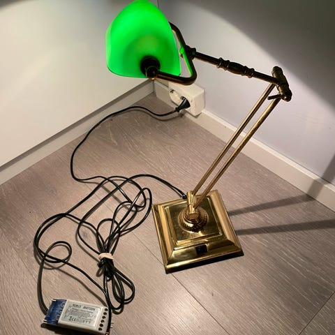 En spesiell, vakker, høy bordlampe i hvitt glass med grønt mønster. lampeskjermen er lys grønn