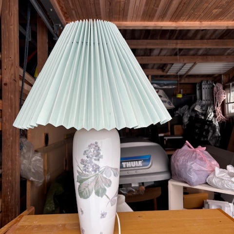 Søt liten, retro bordlampe i glass med blått mønster, hvit skjerm