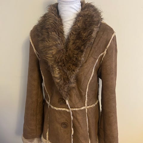 Kort, figursydd shearlingjakke i ekte skinn med myk, ekte pels på krage og mansjetter.