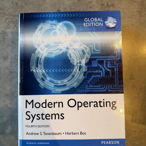 Modern Operating Systems lærebok innen informasjonsteknologi, fjerde utgave, skrevet av Andrew S. Tanenbaum og Herbert Bos.