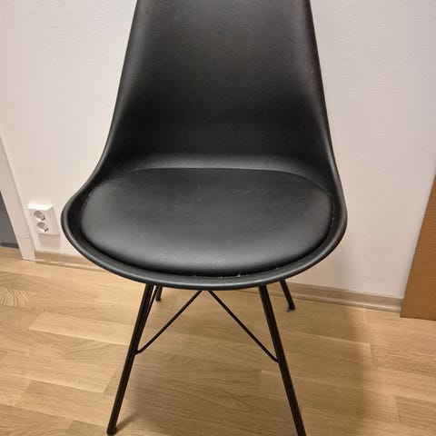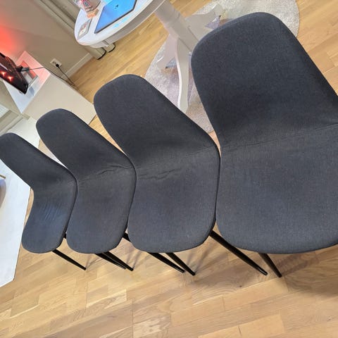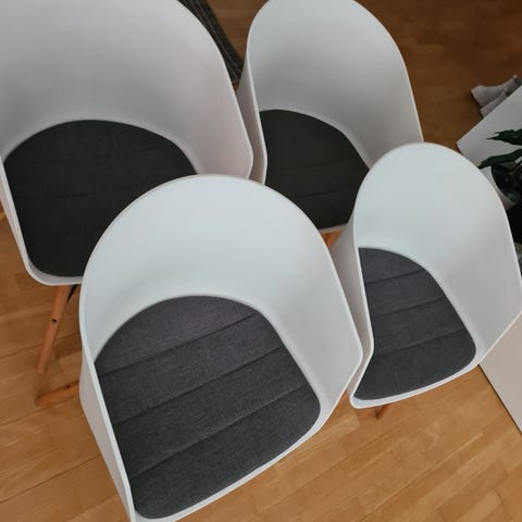 3 hvite stoler med grått stoffsete. Hvite ben. Selges samlet.