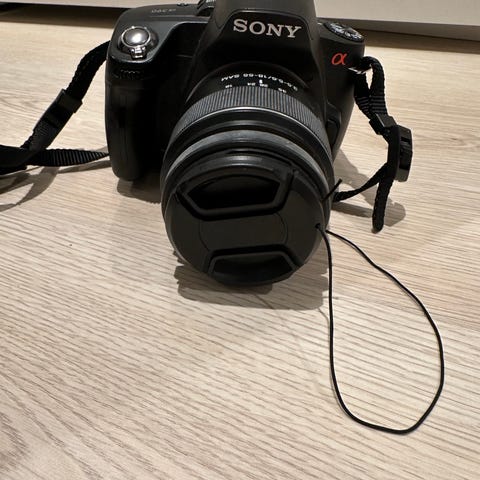 Sony Alpha speilreflekskamera med utskjermbar skjerm og utskiftbart objektiv. Kameraet har flere kontrollknapper for manuell justering og er egnet for fotografering i ulike situasjoner.