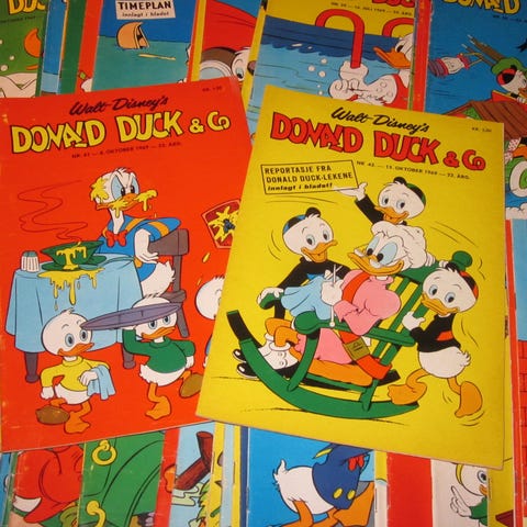 Har komplett hele 1980-tallet Donald Duck samt noen enkeltblader fra 1960-og -1970-tallet. Bladene er for det meste i god til pen stand, men noen er i dårligere forfatning. Selges samlet 1.500. Må hentes i Sandvika.