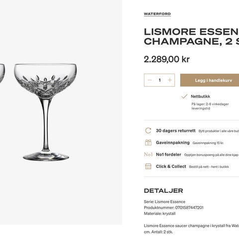 4 glass Waterford Mixology champagneglass. Kjøpt på Brødrene Pedersen i Stavanger. Brukt et par ganger, ser helt nye ut, ikke et eneste bruksmerke. Nypris 3500.-Selges for 1900,-