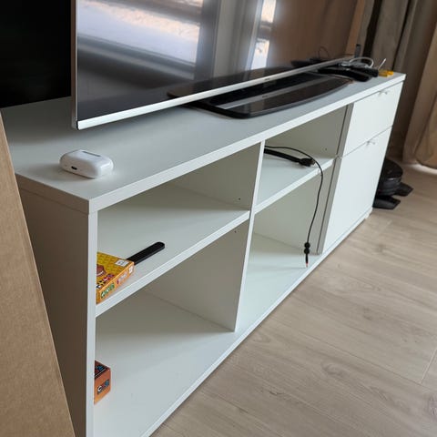 Pent brukt tv benk som kan brukes til å sitte på. Den ene skuffen er knust i bak kant