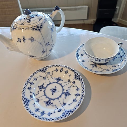 B&g copenhagen måke servise sett i porselen bestående av tallerkener, kopper, tefat og serveringsdeler. Settet har et klassisk design med dekorative mønstre. Egnet for daglig bruk og spesielle anledninger.