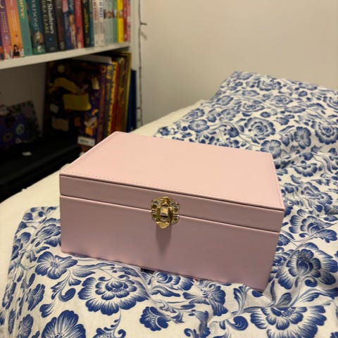 Accessorize smykkeskrin med flere skuffer og ringerull. Skrinet har en nøytral beige farge og er laget av mykt materiale. Designet for oppbevaring av ulike smykker som ringer, armbånd og øredobber.
