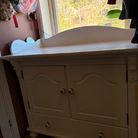 Kongelig søtt stellebord i klassisk stil, med stilisert grå krone malt på skapdøren. Avtakbar stelletopp gir flere funksjoner.