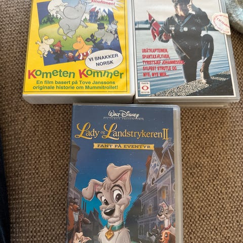 5 stk VHS filmer selges for 250 kr samlet eller 75 kr pr film. Evt. Frakt kommer i tillegg. Kjenner ikke tilstanden på filmene, har ikke spiller selv, så får ikke sjekket. Selger derfor uten noen form for garanti for at de virker som de skal. Ser hele og fine ut. Har selv kjøpt disse på marked. Ole Brumm - Helten fra hundremeterskogen, Bumbo, Ivo Caprino med bla. Karius og Baktus, Mummitrollet- div titler, Mummitrollet - Jul i Mummidalen.