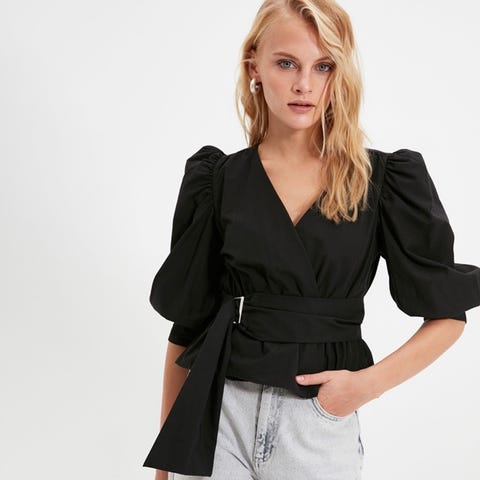 Denne blusen har en v-hals. Den har lange ermer og frynsetee detaljer. Blusen har elastiske mansjetter og en flagrende passform. Denne blusen finnes i svart.