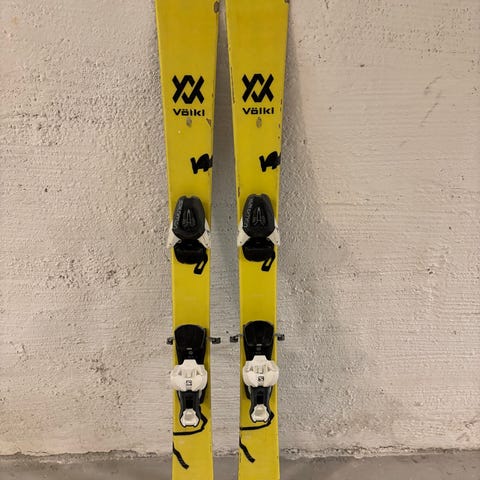 Volkl Revolt Jr Twintip ski med Marker bindinger selges. Skiene er i god stand selv om de har bruksmerker etter å ha blitt kjørt med i vinterparken.