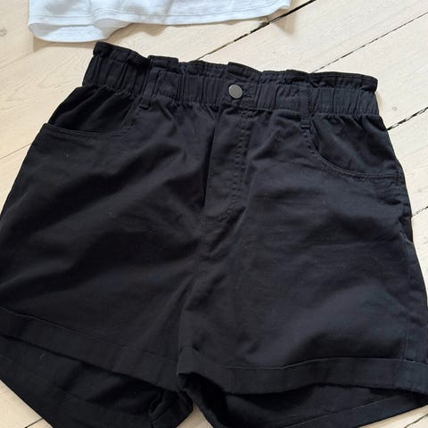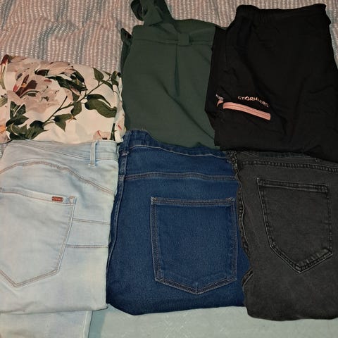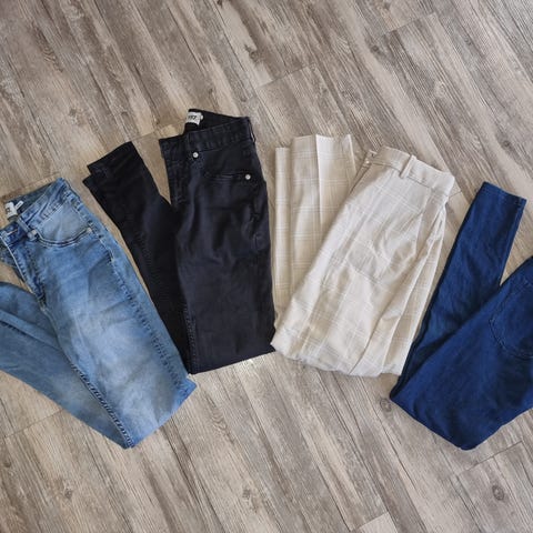 Selger en klespakke med bukser: to olabukser, en skinn-tights fra hm, en dressbukse med strikk fra hm og en grønn cargobukse.