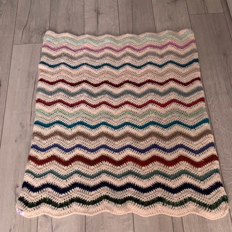 Hjemmestrikket ullteppe til baby. Har svak flekk på ved det ene hjørnet, se bilde. Mulig det går an å få bort. Ca mål 95x65. Ingen dyr eller røyk i husstand