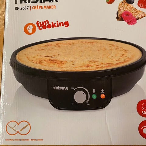 Tristar elektrisk kakepanne med rund form og justerbar temperaturkontroll. Produktet har et sort utseende og leveres med strømkabel. Egnet for baking av pannekaker og lignende matvarer.