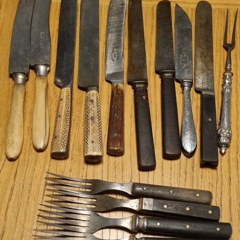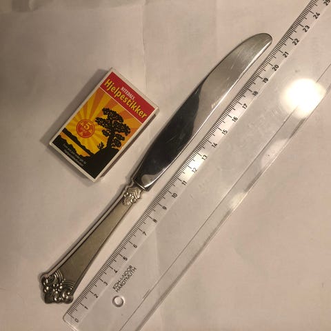 6 kniver 24 cm, med enbokstavs monogram (T eller J ?) Merket 830S og merket til Aase, klingen (stålet) er merket Atkinson Bros Sheffield Stainless på klingen (stålet). Allminneligei bruksspor.