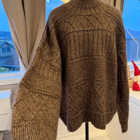 Hjemmestrikket genser i fargene mosegrønn og hvete, strikket med drops air. 💚🤍 Det er en M, men en litt kort modell. Den strekker seg dog noe etter hvert