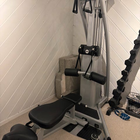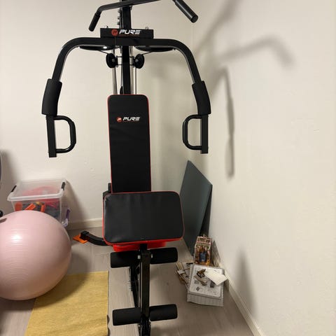 Multigym treningsapparat med integrert benk og vektstabel. Utstyrt med flere funksjoner for styrketrening, inkludert arm- og benøvelser. Passer til hjemmebruk for helkroppstrening.