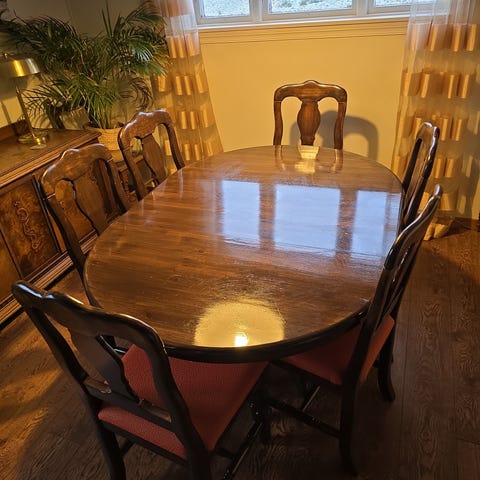 Heltre furu Spisebord med 8 stoler med stofftrekk som er hele og fine.