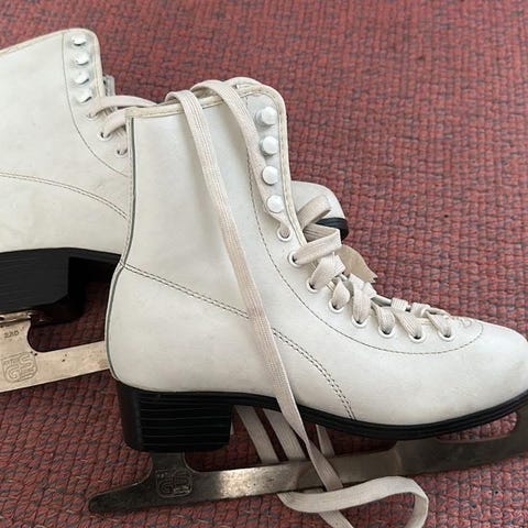 Hvite barneskøyter i størrelse 33. Gis bort, fordi den ene skoen hat løsnet litt fra sålen (se bilde). Kanskje den kan limes eller fikses av en skomaker?