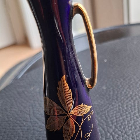 Liten vase (høyde 7,5 cm, diameter 5 cm) og to små asjetter (diameter 8 cm) med blomsterdekor og gullkant fra Bareauther Porzellan (bavaria porselen).