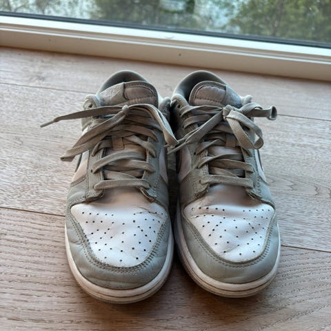 Selger et par helt nye Nike Dunk Low i en stilig grønn og beige fargekombinasjon med oransje lisser. Skoene er ubrukt og i perfekt stand. Komfortable og moderne sneakers, perfekte til både hverdagsbruk og samling.