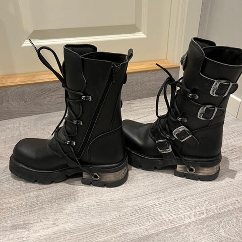 Pent og lite brukte NewRock sko med svært høye hæler selges. Type M.Punk 228. Str. 39, men litt liten i størrelse. Ny pris €239.