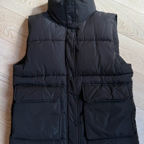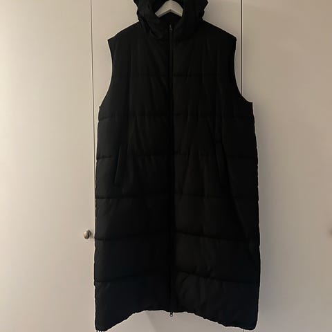 Lang svart boblevest med lommer og hette. Glidelås. Går til midt på leggen ca. Knapt brukt, hel og fin. Fin alene med og under jakker / kåper. Fra Bil bok og str small.