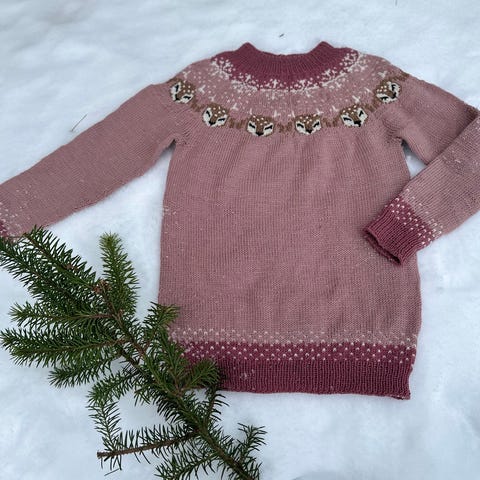 Dottie dådyrgenser strikket i str. 1-2år. Strikket i original garn tilhørende oppskrift. Ikke brukt. Tilhørende lue