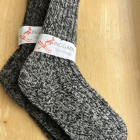 Ullsokker er strikket med Viking sportsragg 60% ull, 20% nylon,n 20% akryl og Fabel 75% ull, 25% polyamid.