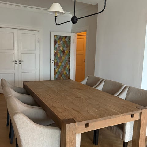 Pent brukt og ingen synlige skader. Bordet inkluderer 2 stk ileggsplater a 50 cm. så total lengde kan bli 280 cm.