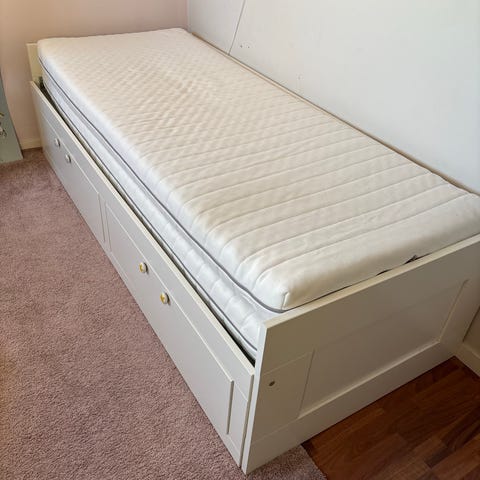 Det beste med Brimnes og Hemnes dagsenger er at du selv velger om du vil ha enkel- eller dobbelseng. Smart løsning når du ønsker mer plass. Medfølger 2 fine, gode madrasser, med avtagbare og vaskbare trekk: