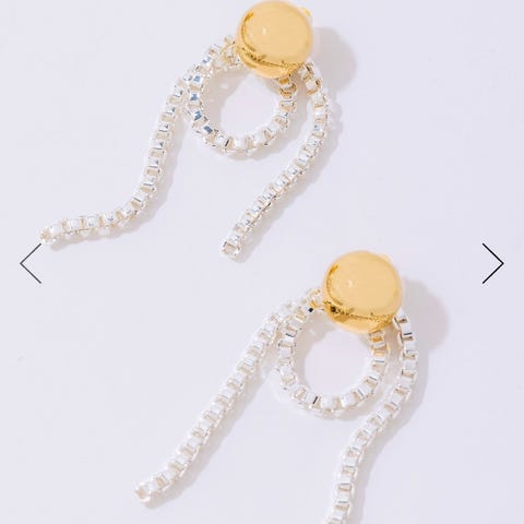 Disse statement-øredobbene har en stor, skulpturell spiral med glitrende krystaller og en stor akryl-perle. Sølvbelagt messing med glasskrystaller og ørestifter i 925 sterlingsølv.