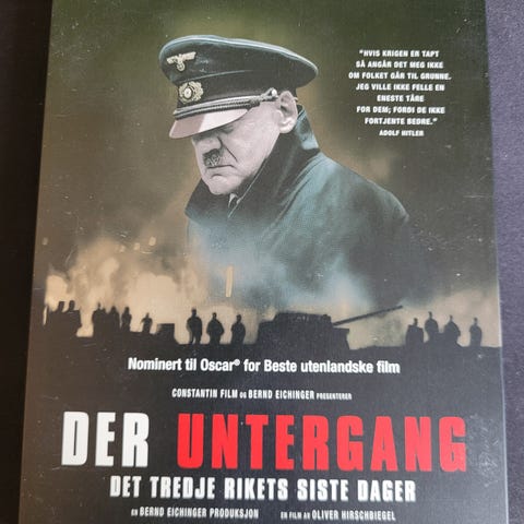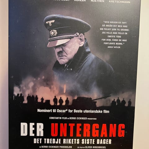 Der Untergang film med motiv fra en dramatisk scene med en mann i uniform og flere personer i bakgrunnen. Passer for samlere og filminteresserte.