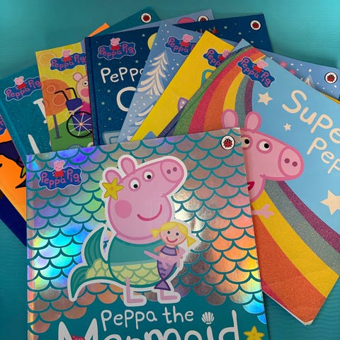 Peppa Pig Peppa Eventyrbøker barnebøker med flere små bøker i settet. Inkluderer bøker som "Peppa har en travel dag" og "Hjulene på bussen". Bøkene har fargerike illustrasjoner og er egnet for små barn.
