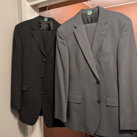 En grå dress i wool stretch. Dressen ble skreddersydd i Thailand, så størrelse er noe uvisst.