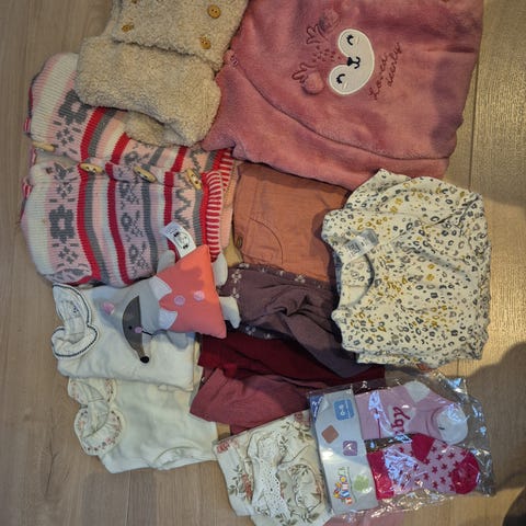Klespakke i størrelse 68 i rosa farge. Inkluderer ulike plagg egnet for små barn, laget i komfortable materialer tilpasset barnets behov. Klær fra Cubus, Joha, Primark, H&M, Buddy & Hope, Reflex