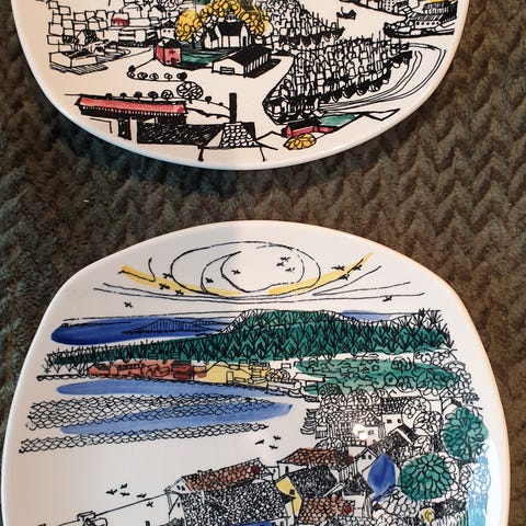 Dekorative platter fra Stavangerflint. Motiver: nigardsbreen, Salten/Nordland, Telemark, Sogn og Fjordane/Møre, Trøndelag.