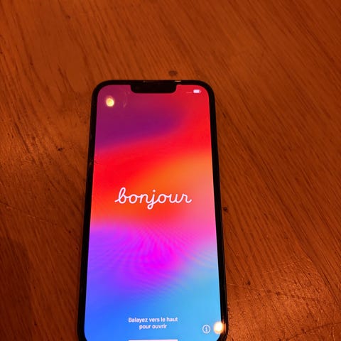 Apple iPhone 13 mobiltelefon med 128 GB lagringskapasitet. En kompakt modell med to kameraer på baksiden, i lys rosa farge. Ene kameralinsen har en skramme, men merkes ikke ved bruk.