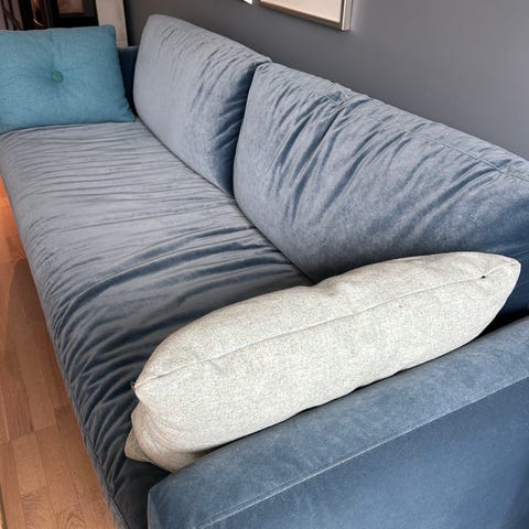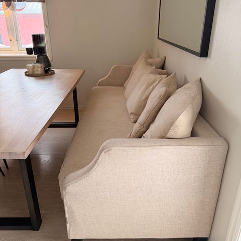 Pent brukt sofa, renset for ett års tid siden. Bordet av eik er også pent, men har noe små hakk. Kan fint pusses vekk. Stabile mobiler som selges da vi har kjøpt ny sofa. Kan også få med to stoler som passer til (sort, se bilde)