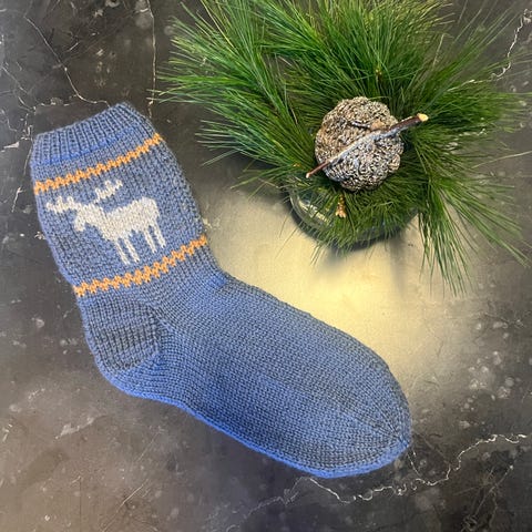 Håndstrikkede sokker strikket i flerfarget Fabel 75% ull, 25% polyamid og Viking sportsragg 60% ull, 20 % nylon 20 % akryl. Sokker har ribbestrikket skaft.
