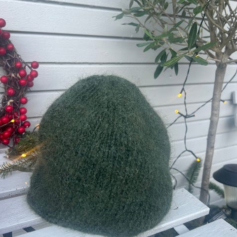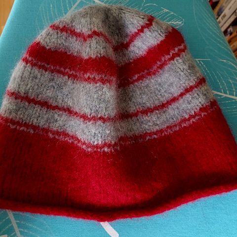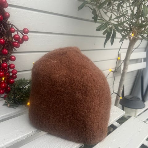 Luen er strikket av ull og tovet og kan formes litt etter hodet ditt når de er fuktig/ i bruk, så størrelsen er veiledende. Ca str L ( 57-58 cm) Unisex.