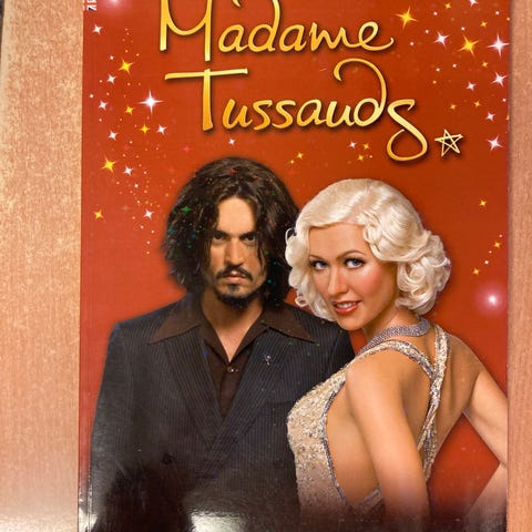 Madame Tussauds Fotobok med svart-hvitt fotografier. Boken har slitt omslag og viser historiske bilder fra Madame Tussauds museum.