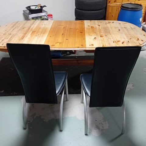 Bordet er lakkert med 5 strøk mattlakk og beinet er hvitlasert furu. Beinet går å kappe om en ønsker en lavere høyde. Det har blitt brukt som spisebord på kjøkken, men hadde sikkert gjort seg som salongbord eller sofabord og (med kortere bein). Krever at det står inntil en vegg der man kan skru fast en list det kan hvile på.