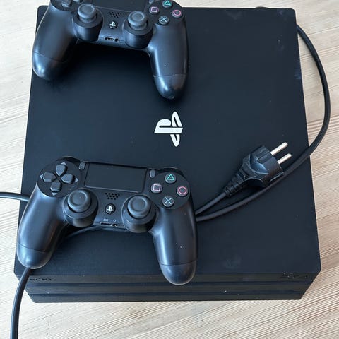 Sony Playstation 4 konsoll med to kontroller og tilkoblingskabel. Konsollen er kompatibel med Playstation 4-spill.