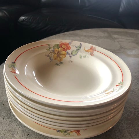 Mønsteret er inspirert av det klassiske "Blue Onion"-designet, med et sentralt blomstermotiv i blått på hvit bakgrunn, omgitt av et gittermønster (lattice) i kanten. Tallerkenen er laget av flintgods og var del av en serie for daglig bruk eller dekorasjon. Slike stykker er populære blant samlere av skandinavisk design.