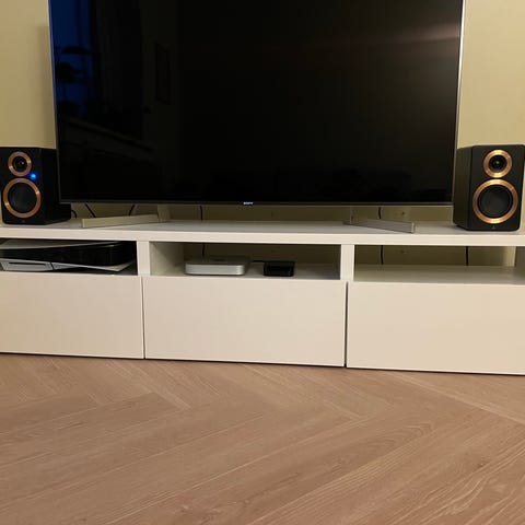 TV-benk med to dører og skuff med åpen hylle i midten.