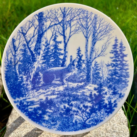 Platter fra Fauna Norvegica-serien fra Porsgrund. Diameter 13 cm. Motiv: elg og oter. Kunstner: Kjell Loa